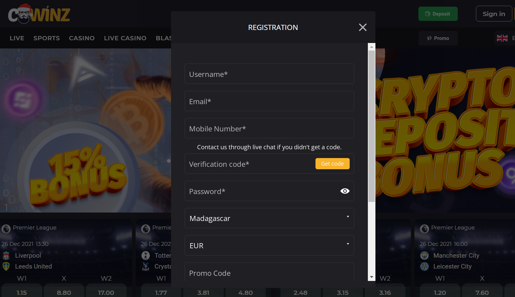 Щоб створити обліковий запис C Winz, відвідайте платформу або надішліть свій номер через WhatsApp на адресу 212777023317. Після цього вам буде надіслано коротку форму. Це не займе багато часу, лише необхідна інформація. Вона повинна включати ваше повне ім’я, адресу електронної пошти та номер національного посвідчення особи. Після заповнення надішліть форму назад, знову ж таки через WhatsApp. Ви отримаєте повідомлення про те, що ваш акаунт C Winz успішно створено. Цей акаунт буде використовуватися для всіх ваших транзакцій на платформі: беттінг, казино, поповнення рахунку тощо. Крім того, агент C Winz завжди на зв’язку, до ваших послуг у будь-який час. Не соромтеся звертатися до нього в WhatsApp, якщо у вас виникнуть додаткові запитання.
